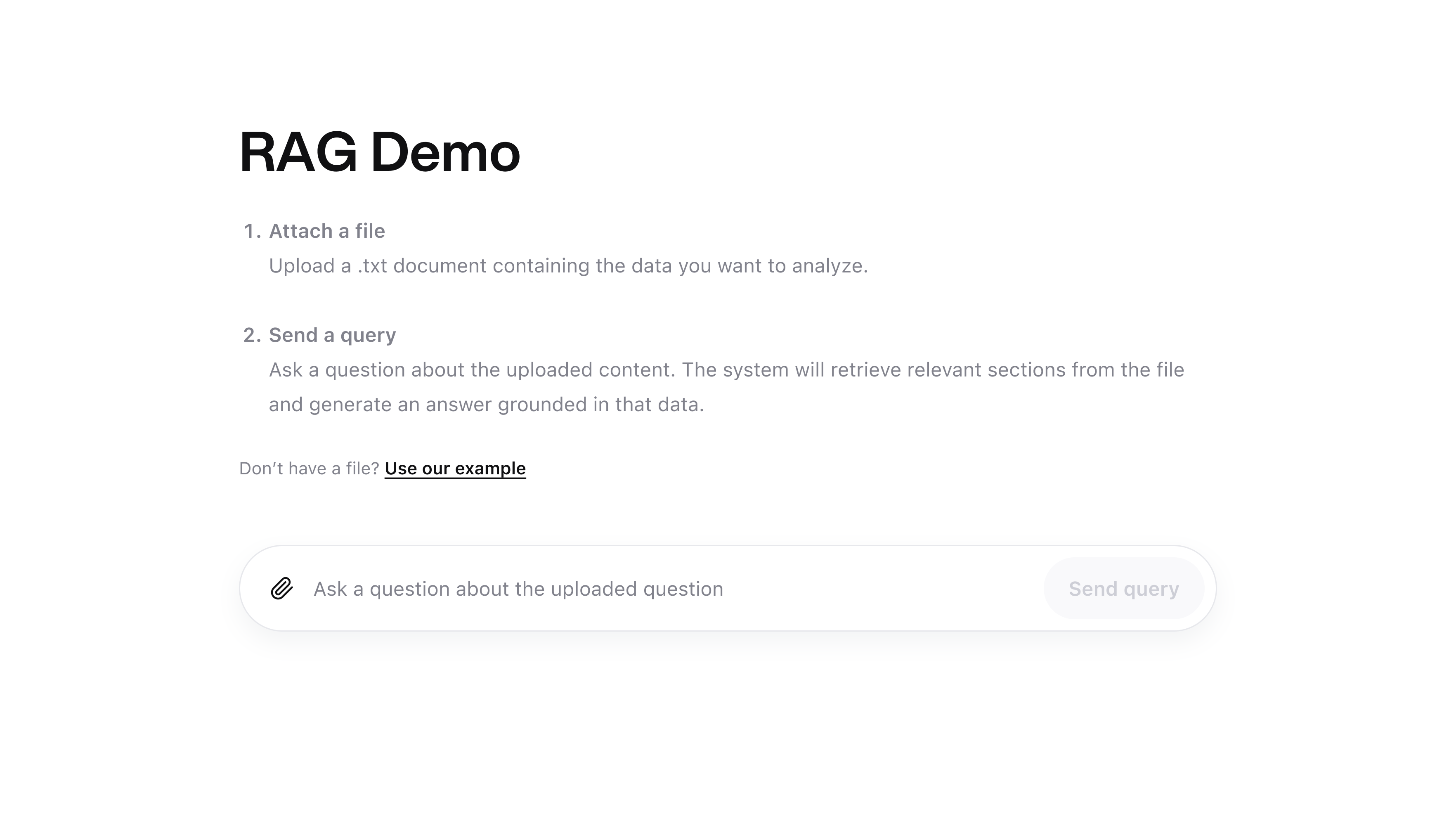 The app is a Next.js project. Upload a .txt file (or use the built-in example), ask a question, and get a streamed answer grounded in that document. Embeddings run entirely on-device via BAAI/bge-small-en-v1.5 — no data leaves your machine during the indexing step.